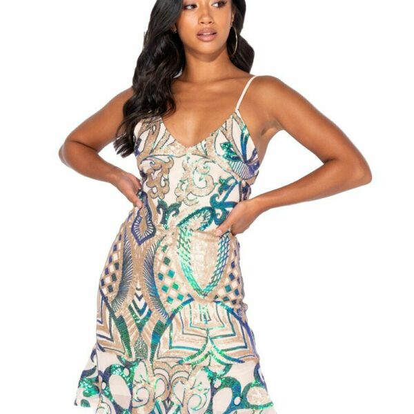 Abito ricamo pailettes donna volant schiena stringato vestito spalline
