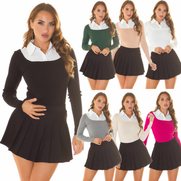 Maglione pull pullover donna con colletto finta camicia manica lunga