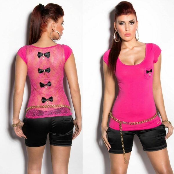 T-shirt maglietta donna pizzo schiena fiocchi strass pendenti manica corta