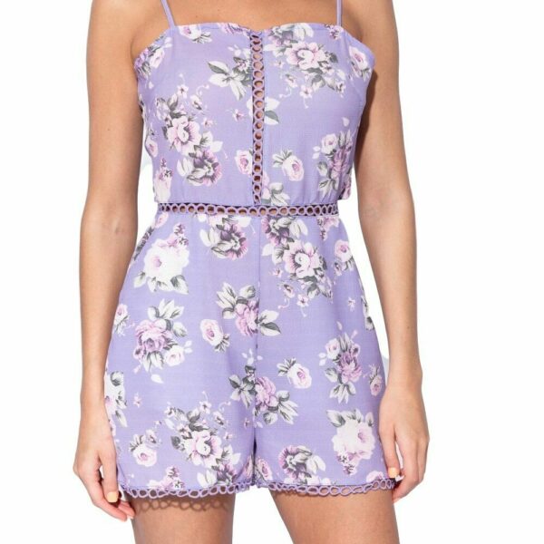 Tuta tutina corta donna overall floreale lilla pizzo trim fiocco schiena