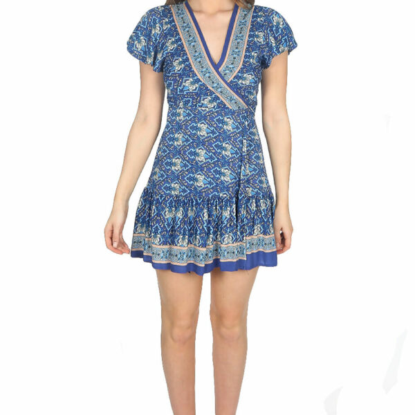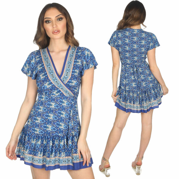 Mini abito donna stampato a portafoglio manica corta volant ad aletta