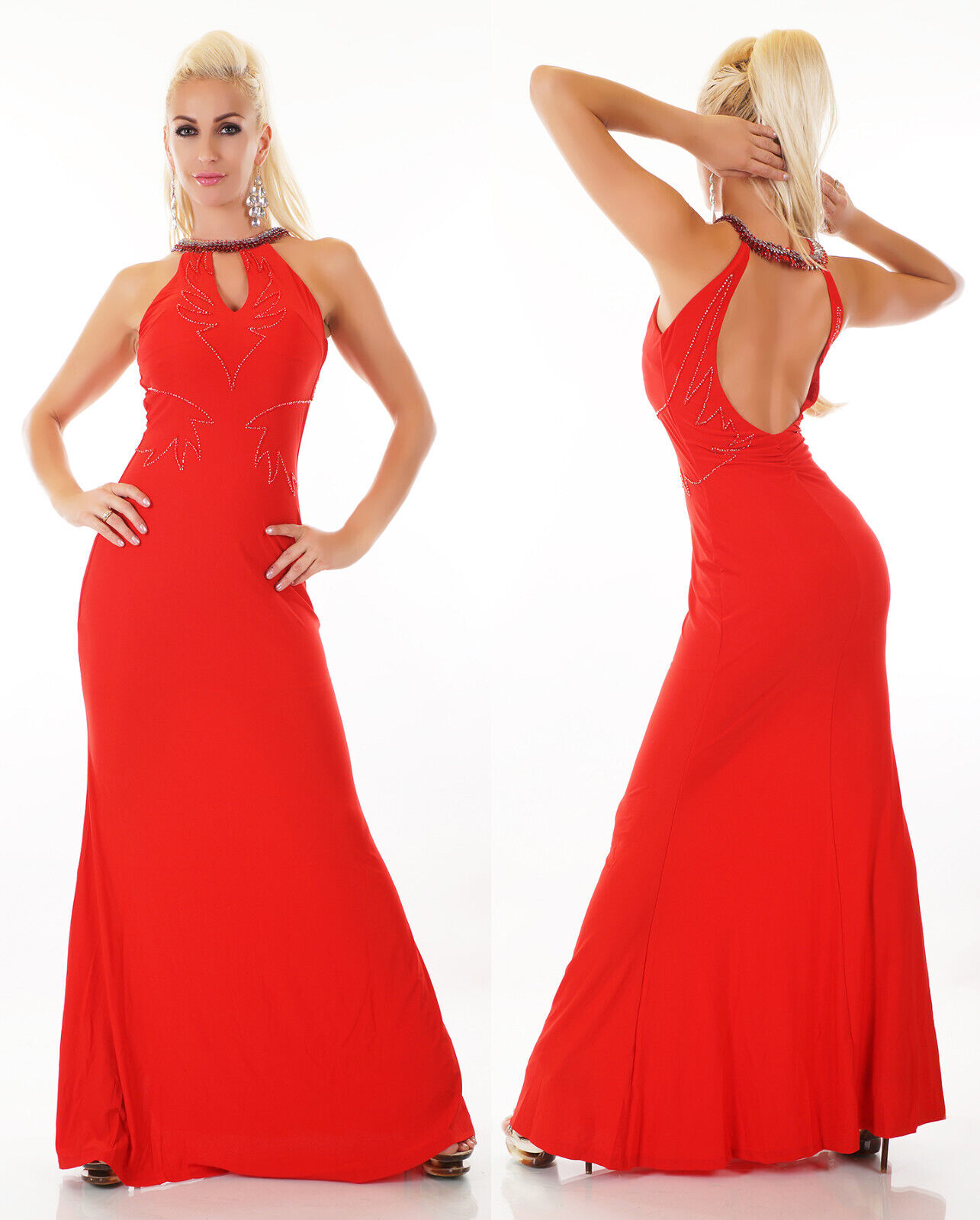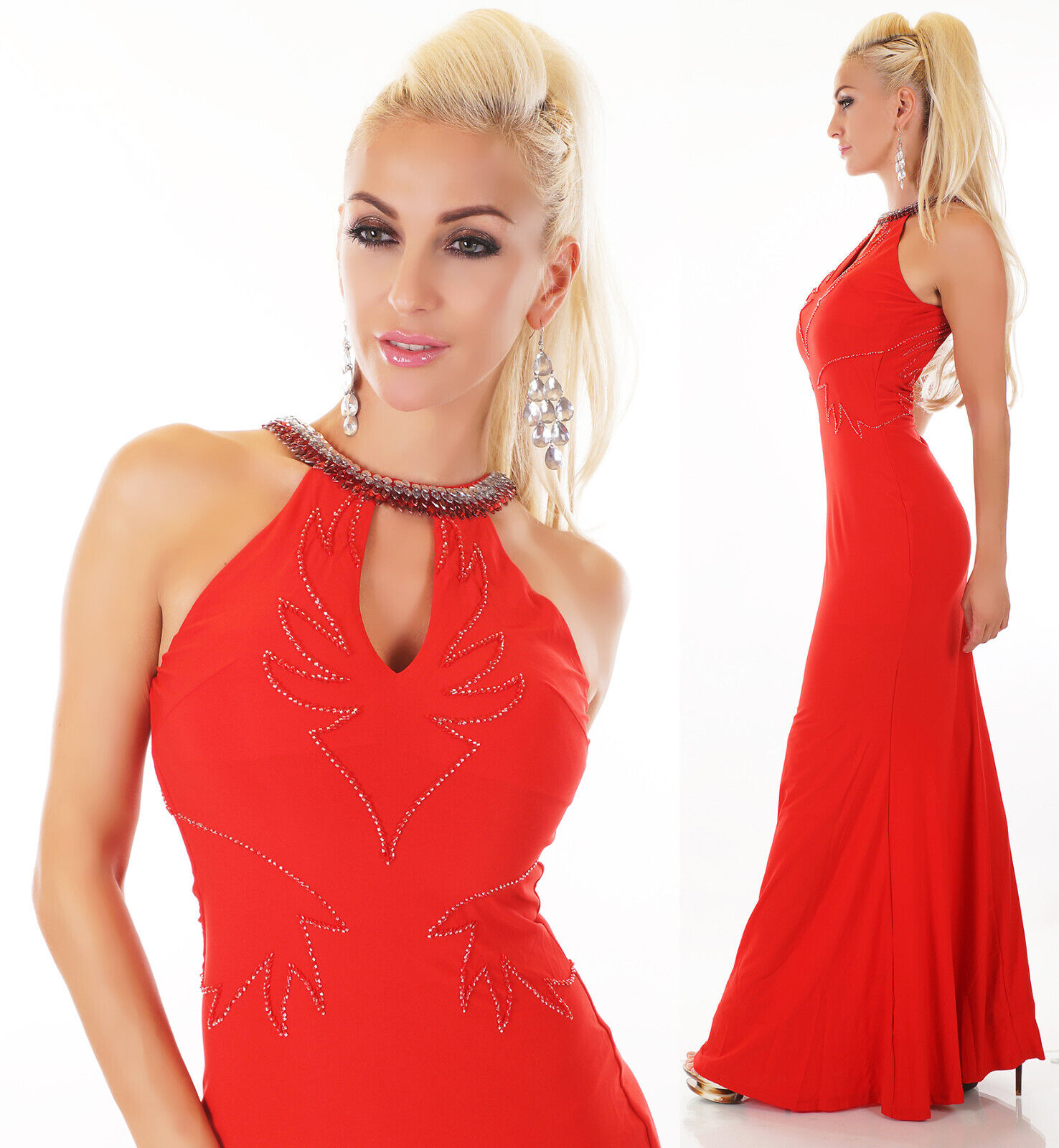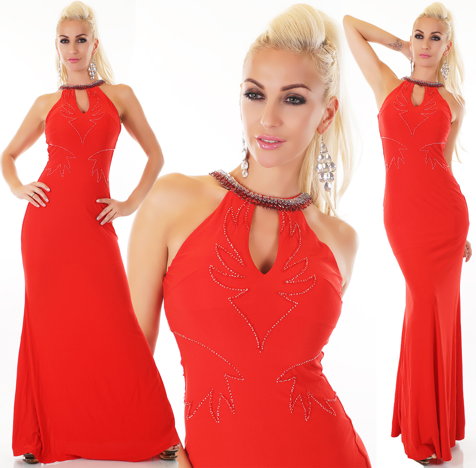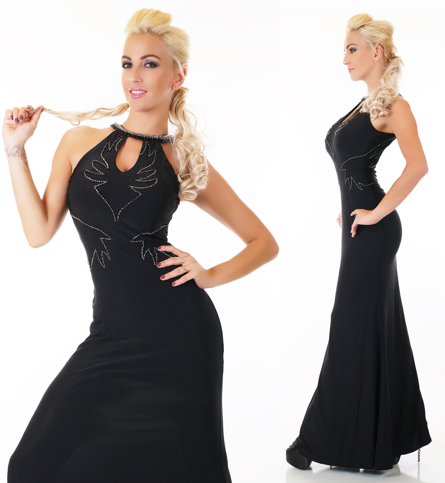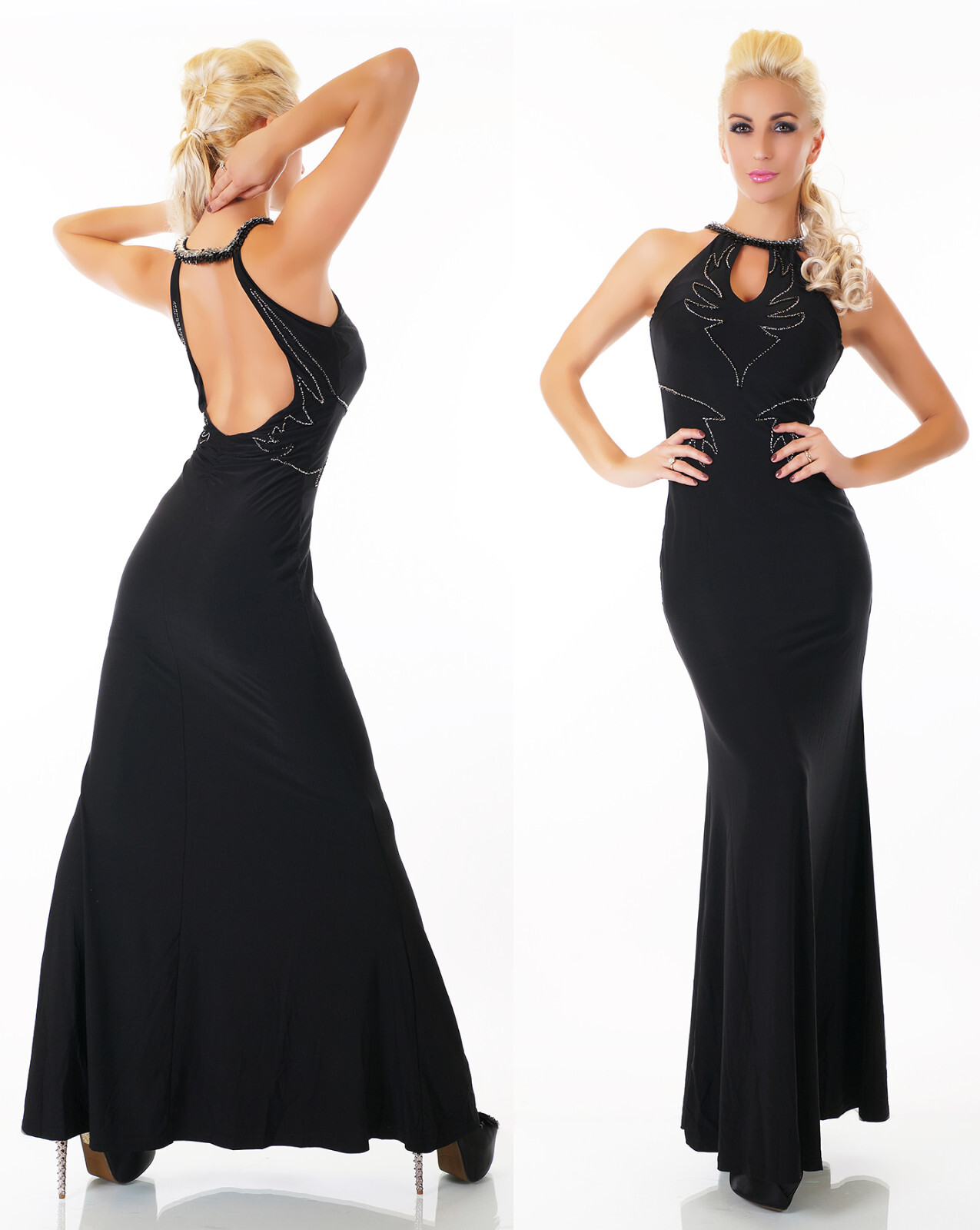 Abito lungo glamour con decorazione di perline sul busto e collo strass