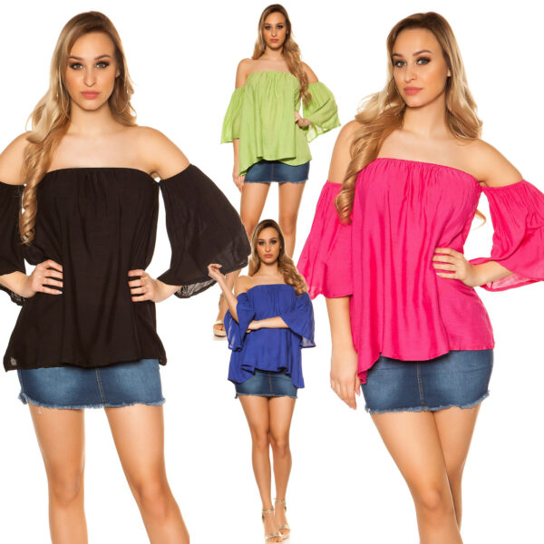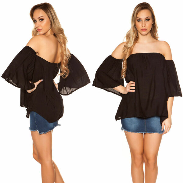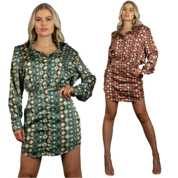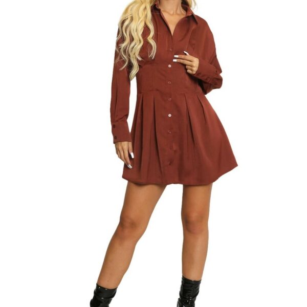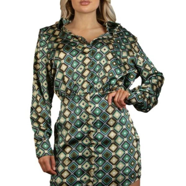 Colletto stondato sia al decoltè che alla schiena, chiusura anteriore con bottoni bombati bianchi