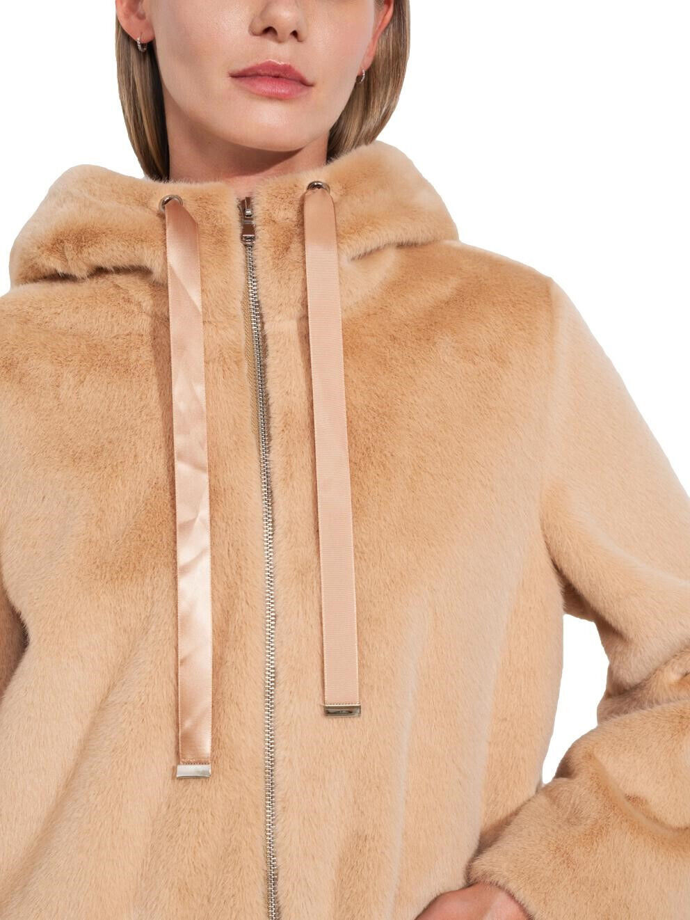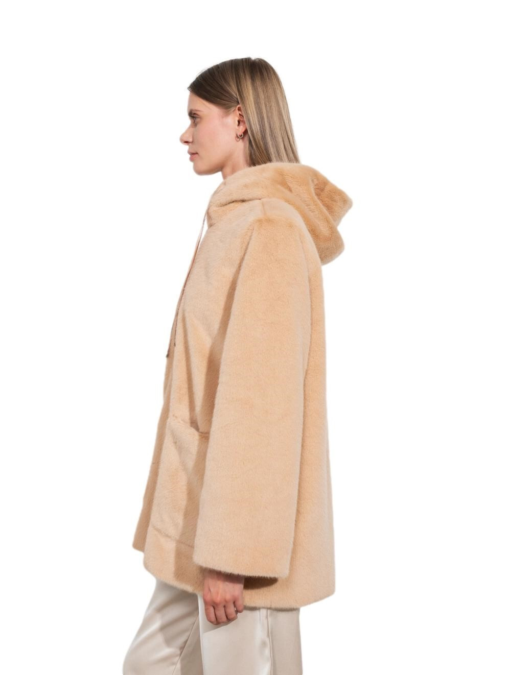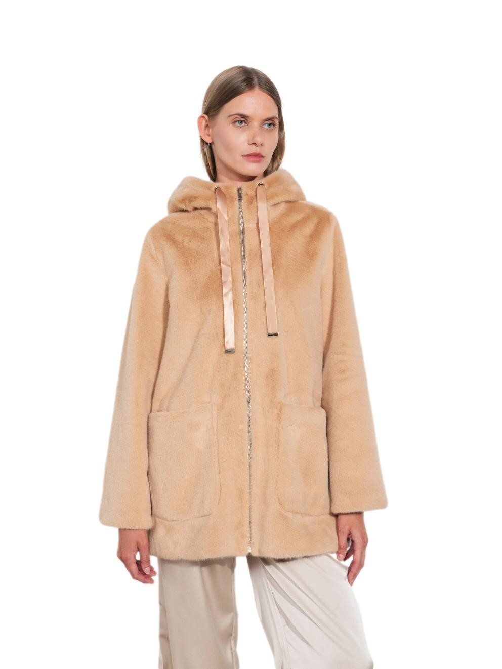 Giaccone stiloso da donna in pelo ecologico con cappuccio e coulisse