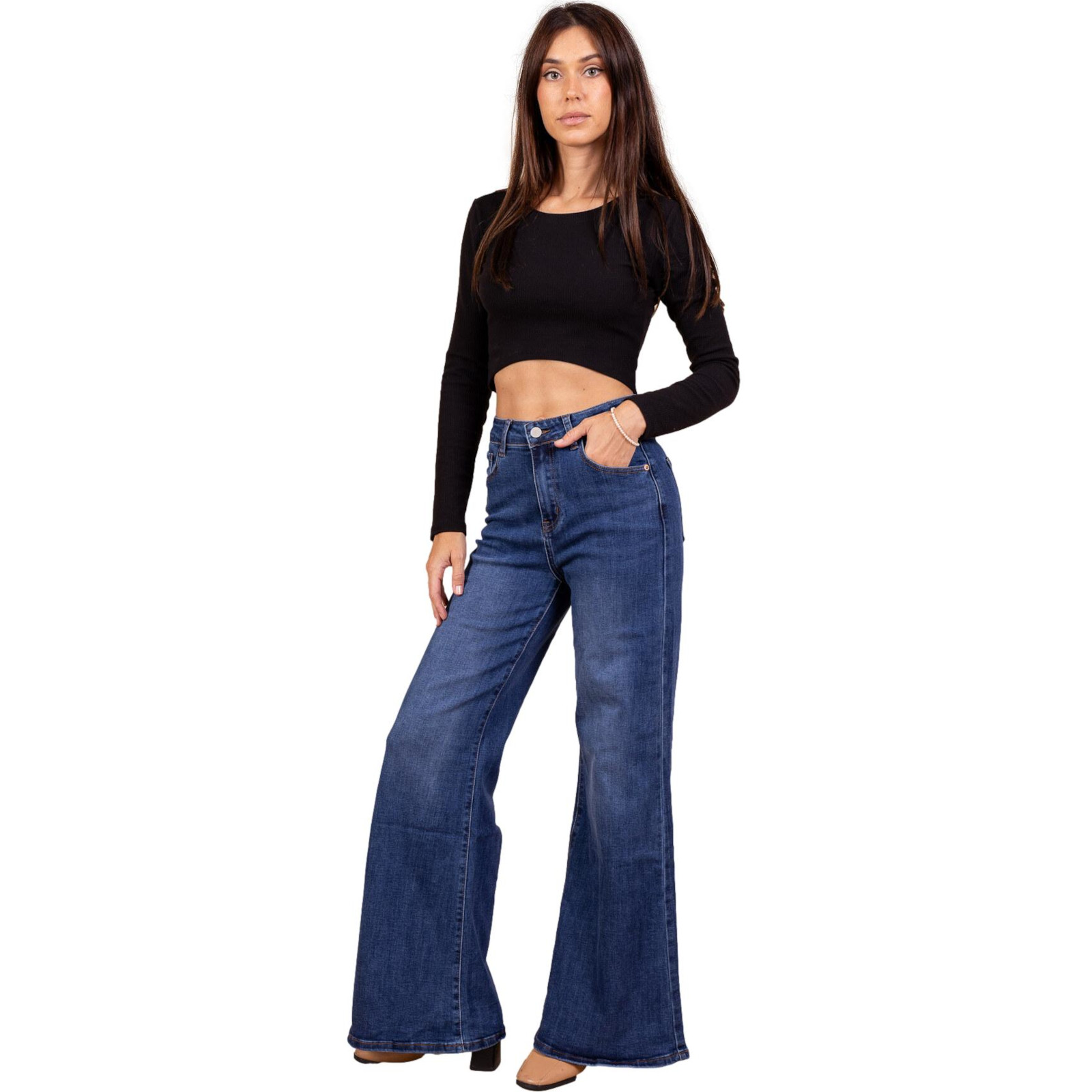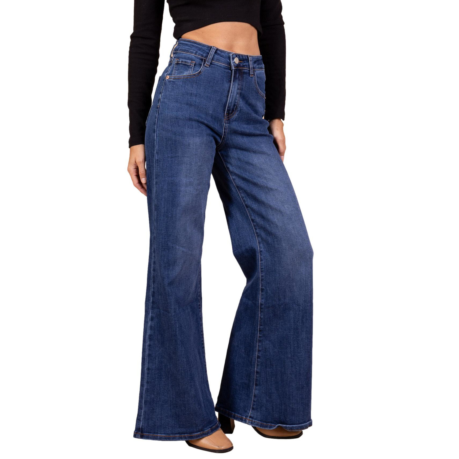Jeans donna gamba larga palazzo a vita alta denim blu scuro