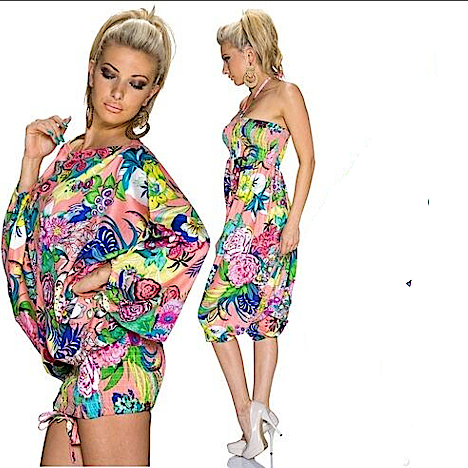 Doppia portabilità per questo prodotto,come maglia con manica a pipistrello ,girocollo e fasciante sui fianchi oppure come tutina al ginocchio ,con scollatura a fascia e spalline centrali da annodare al collo