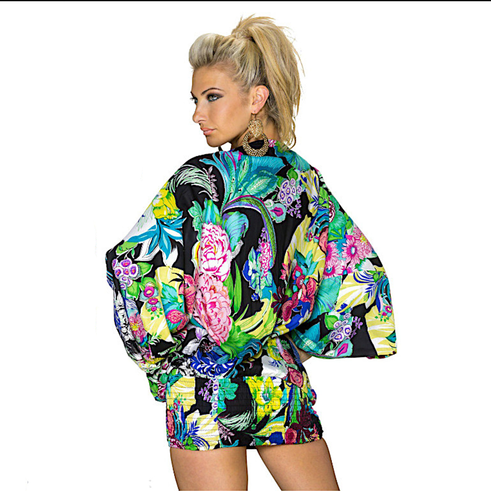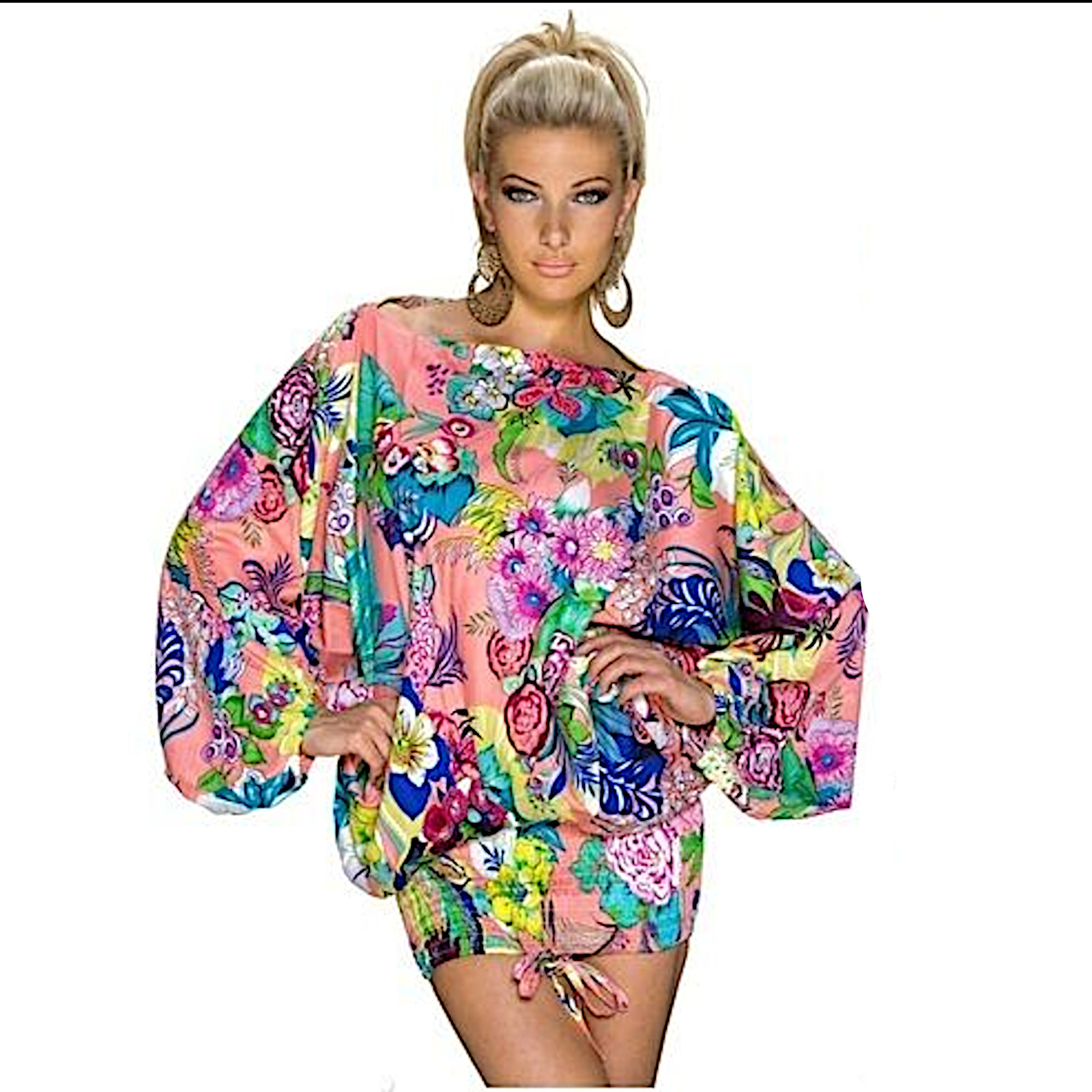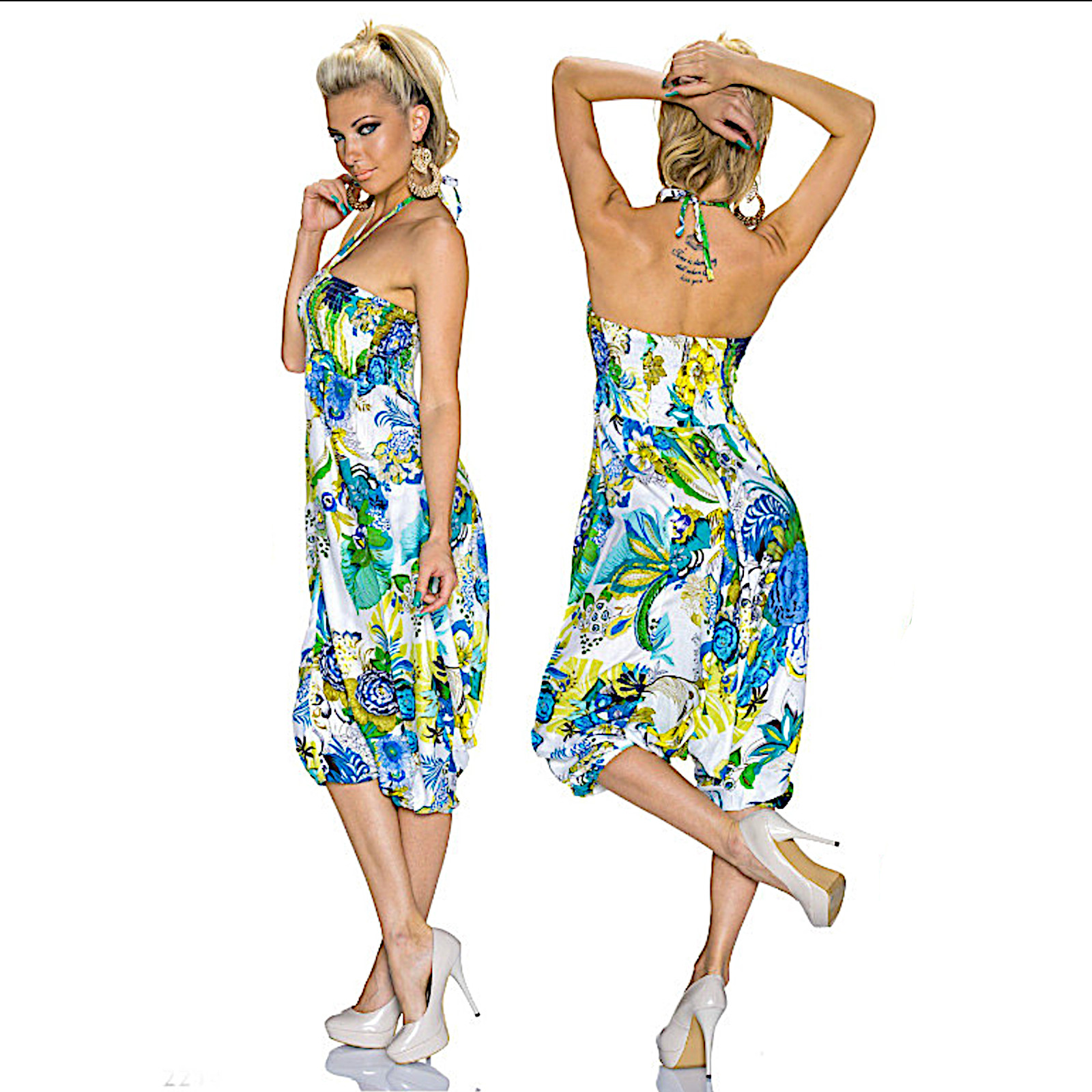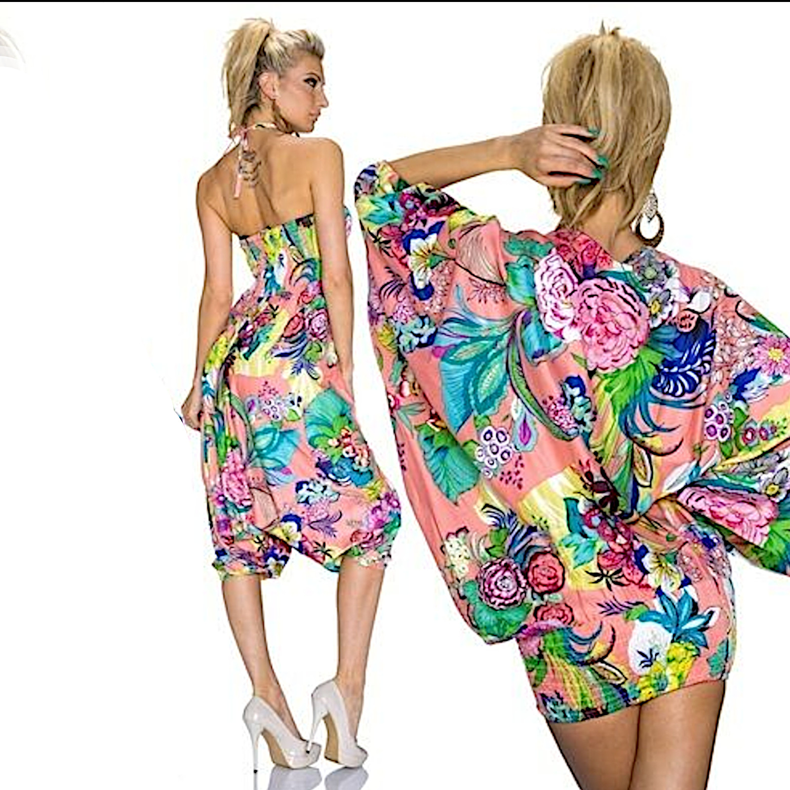 Double portability for this product, as a shirt with batwing sleeves, round neck and wraparound on the hips or as a knee-length jumpsuit, with a bandeau neckline and central straps to tie around the neck