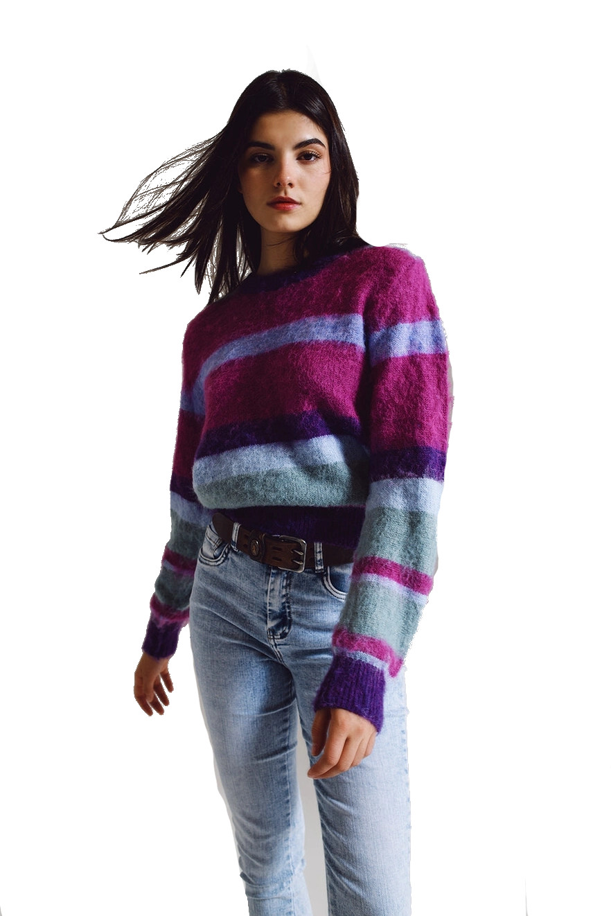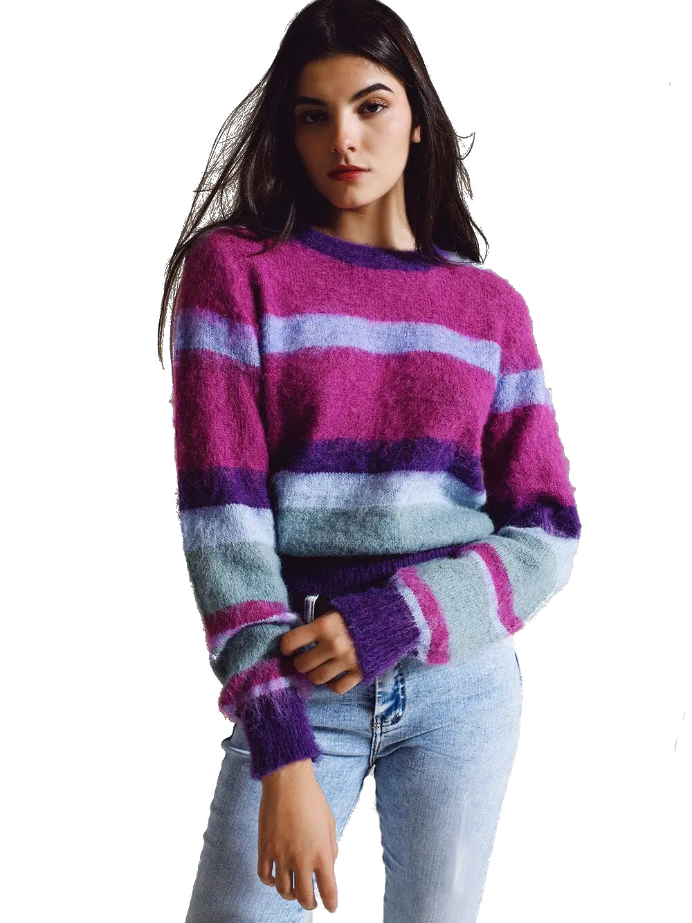 Recensisci per primo “Maglione a righe donna fluffy sfumato soffice tonalità viola girocollo”