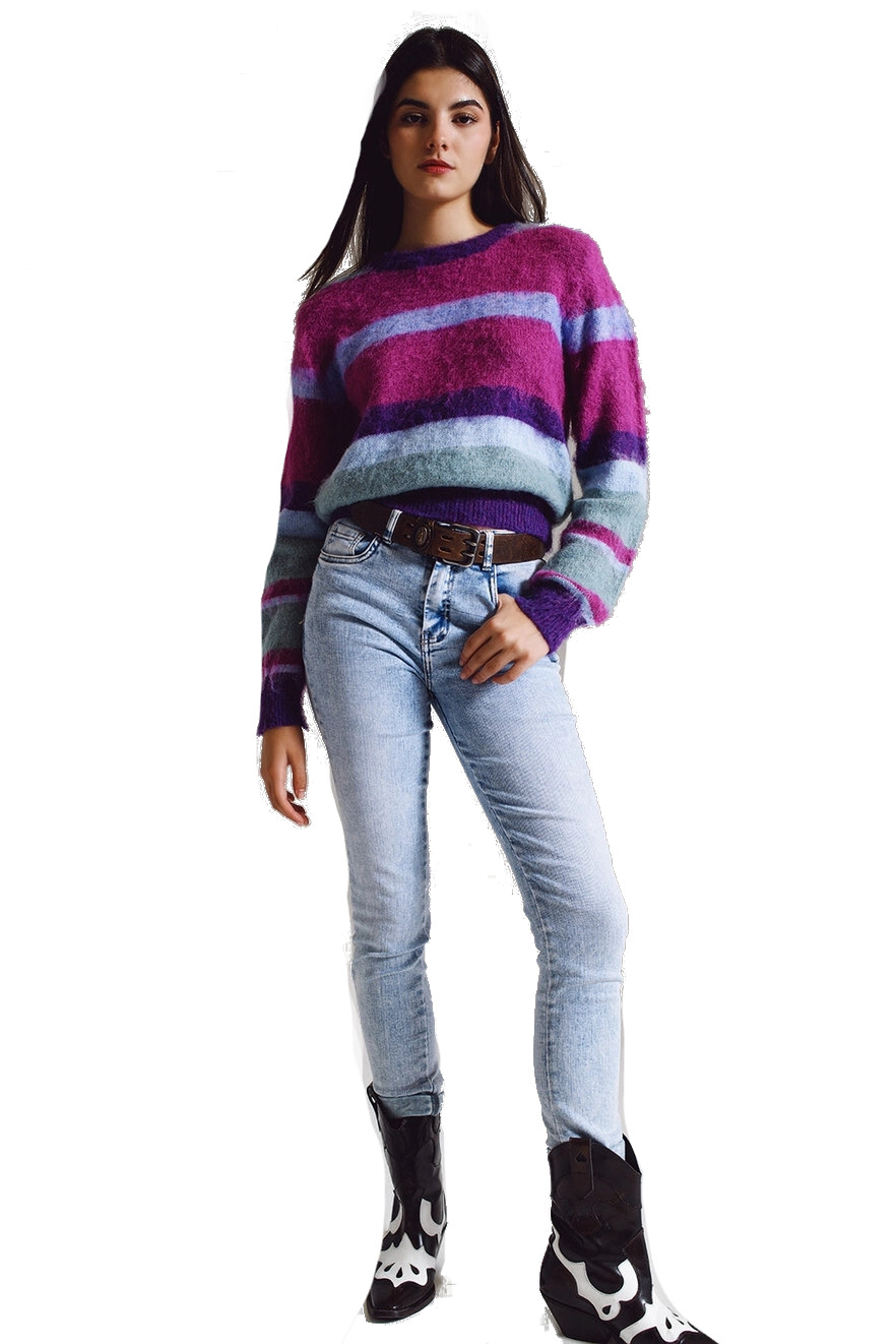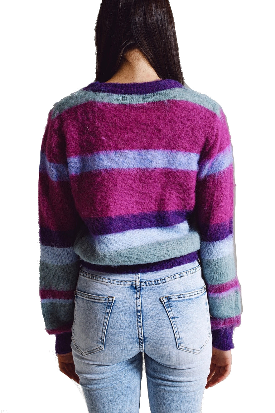 Maglione a righe donna fluffy sfumato soffice tonalità viola girocollo