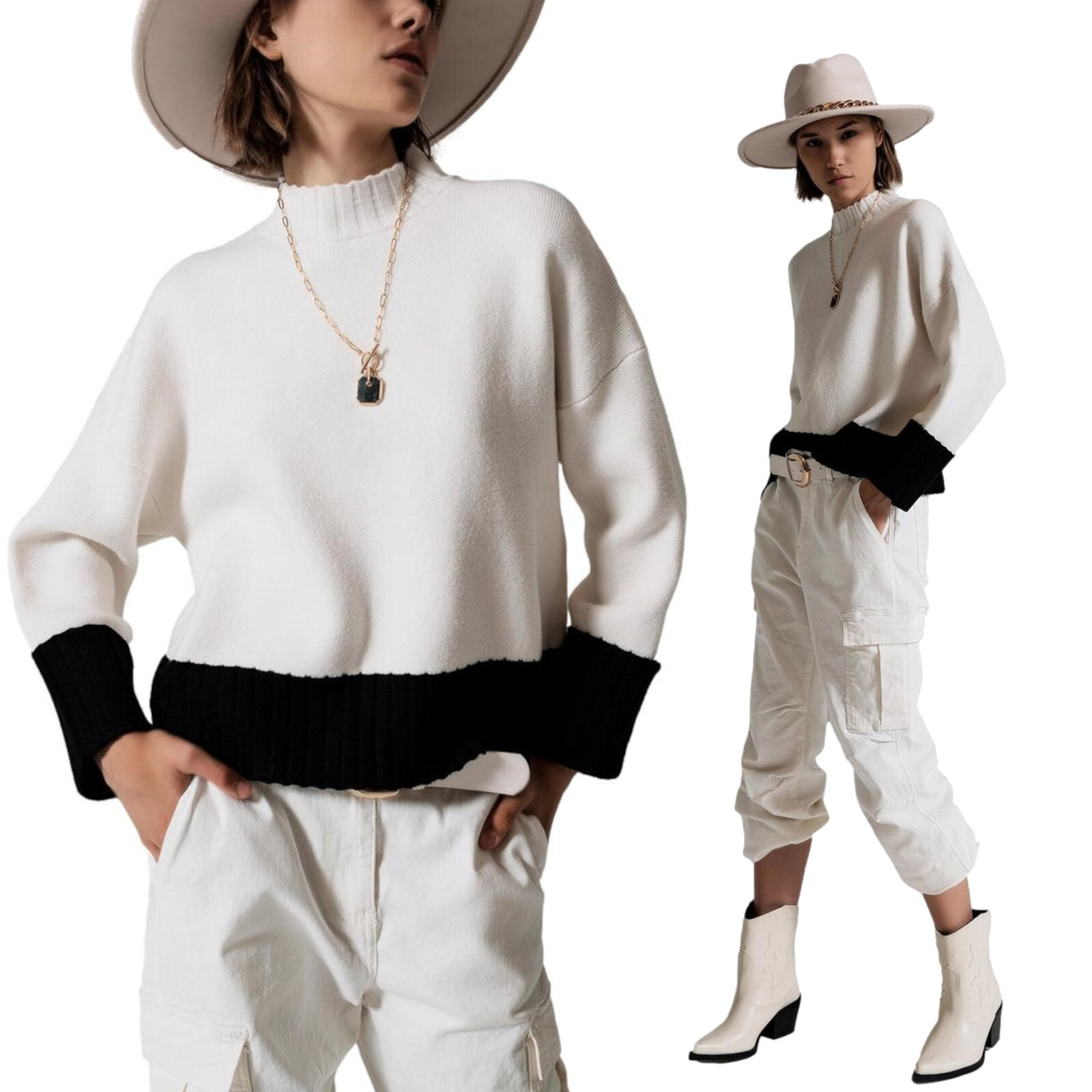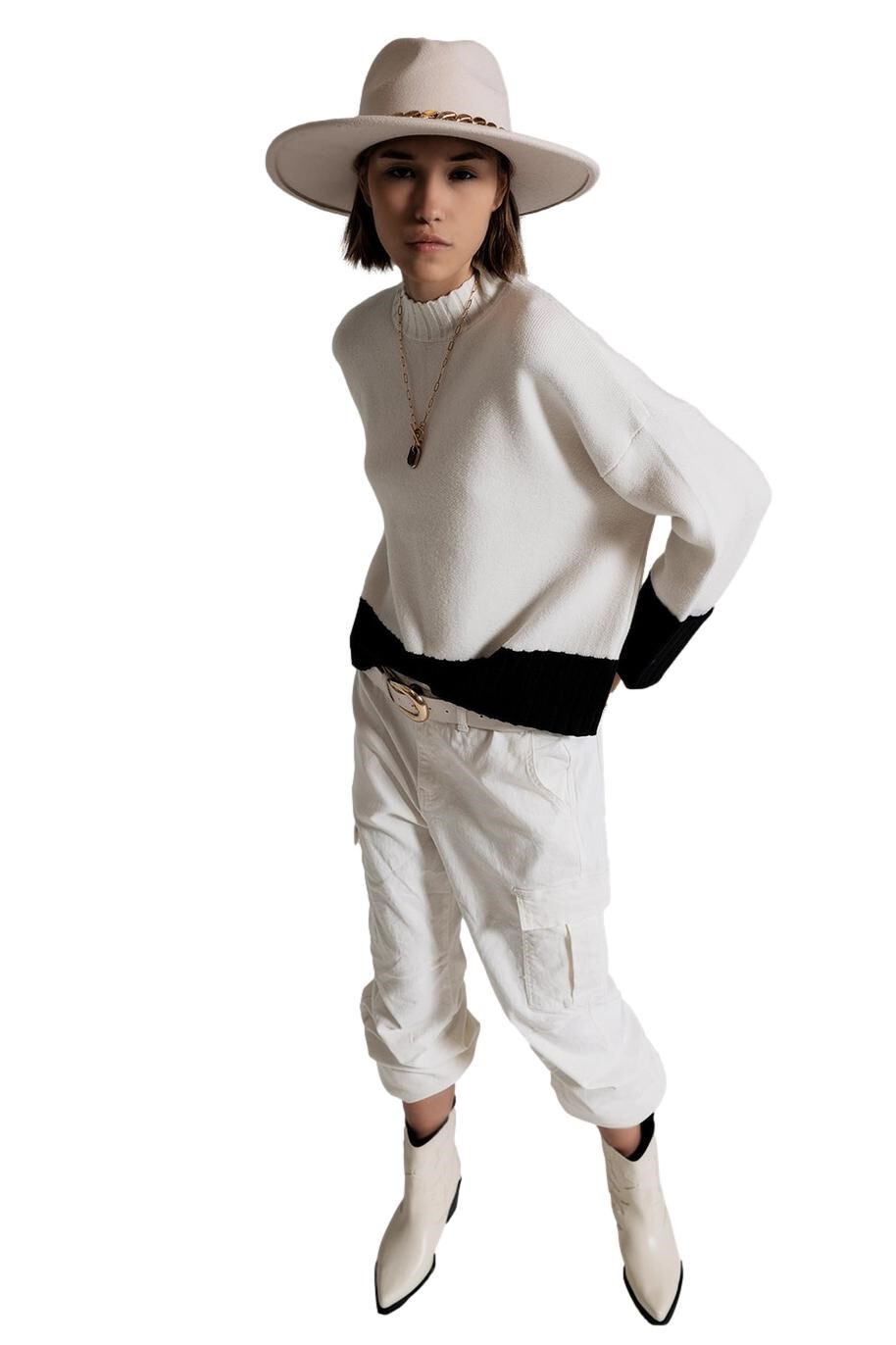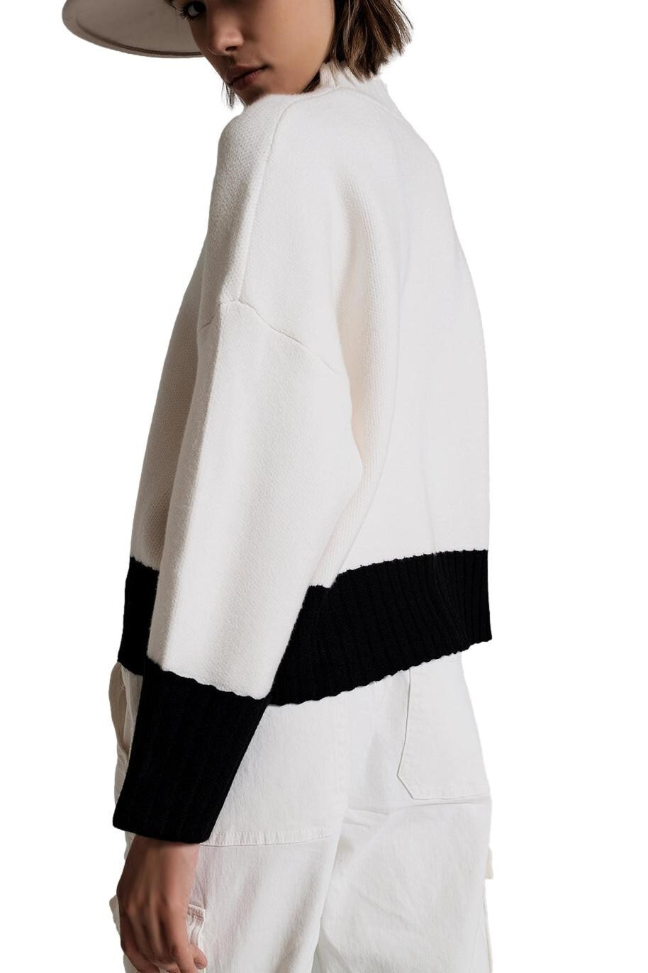 Maglione donna bianco con polsi e orlo neri