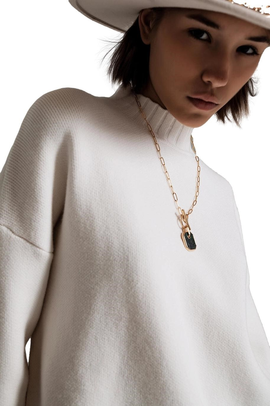 Maglione donna bianco polsi orlo nero tessuto qualità collo camino