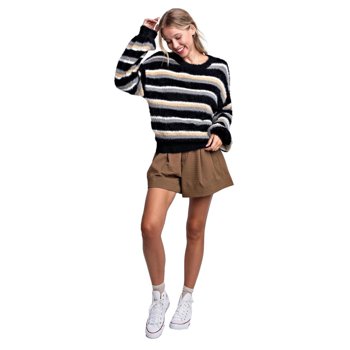 Color: Black with white, beige, and gray stripes