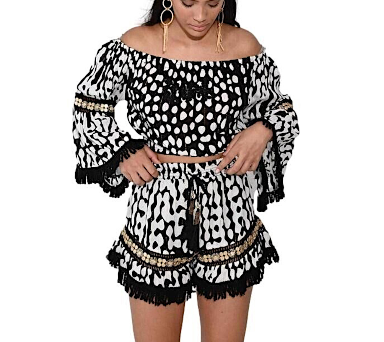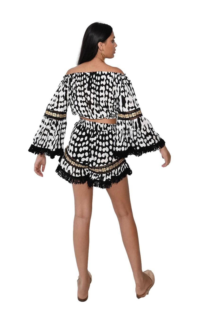 The fringe detail on the hem of the sleeves and shorts adds a touch of boho-chic style. All in all, this look is ideal for outdoor events, festivals, or simply a sunny day.