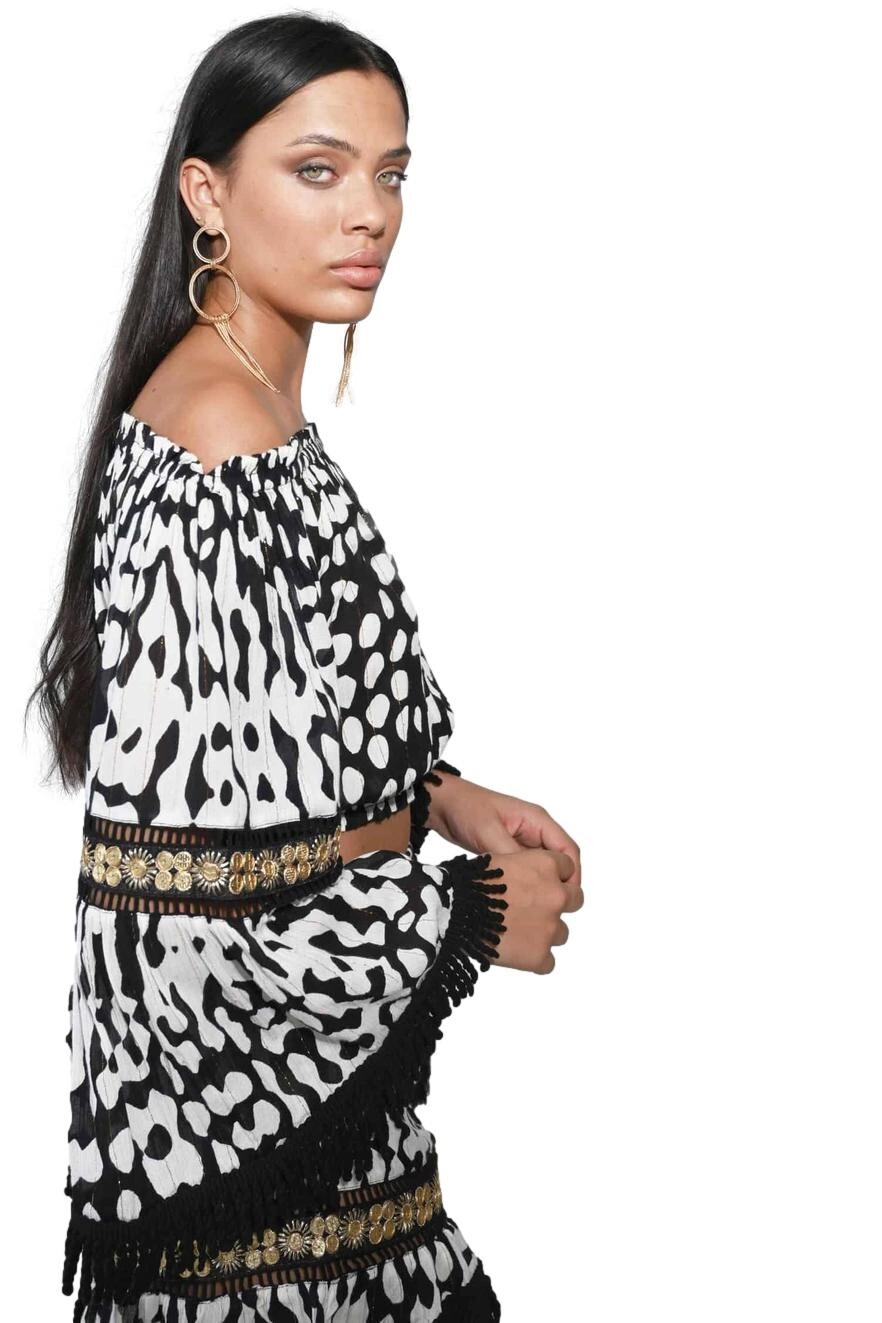 The blouse has an off-the-shoulder design.
