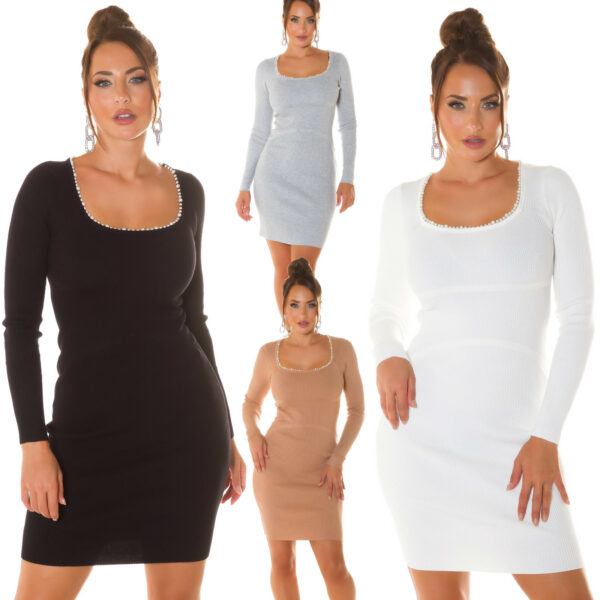 Sexy long knitted dress with slit and central zip decorated with rhinestones