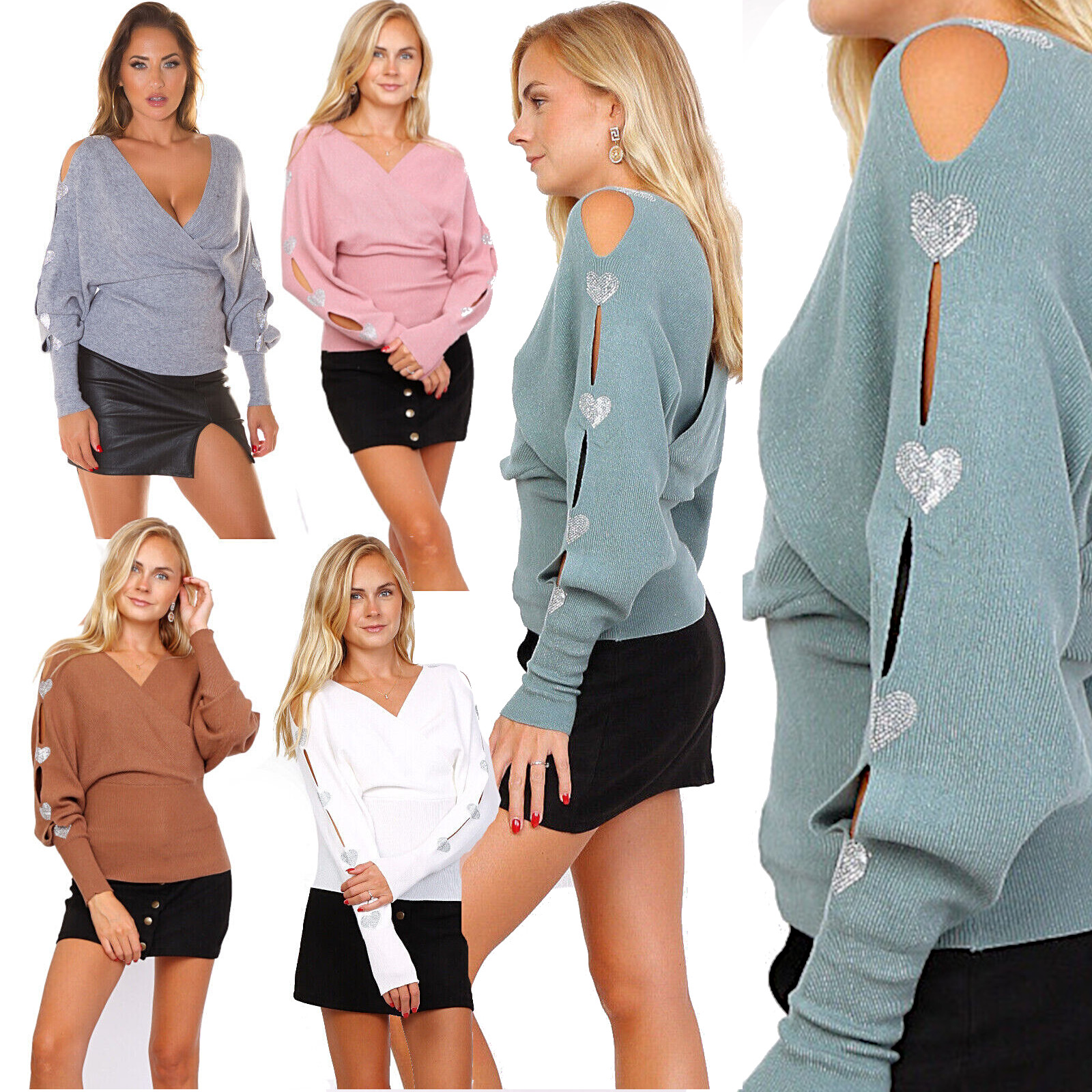 Sweater with cut outs on the sleeves decorated with rhinestone hearts