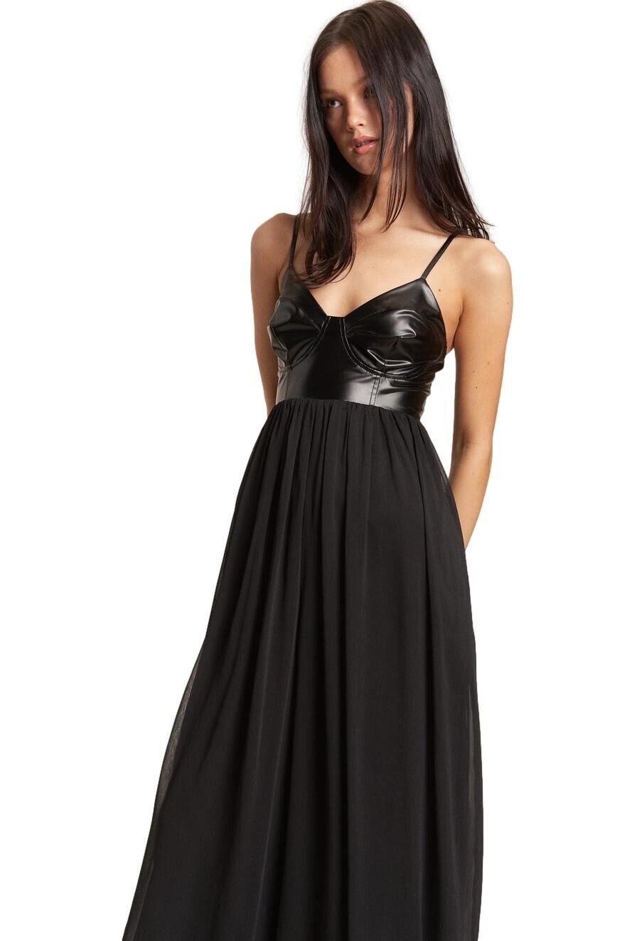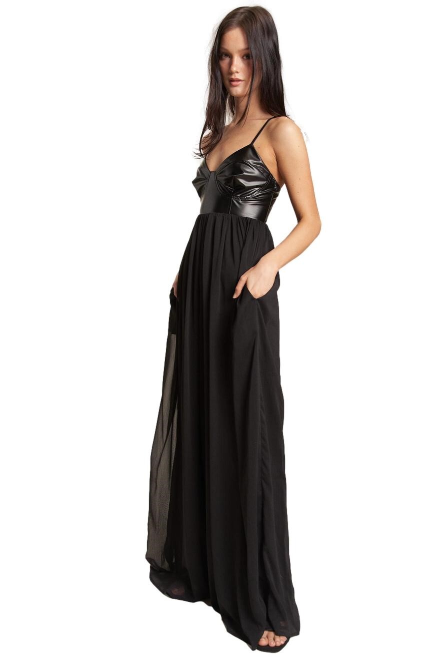 Faux leather bodice with sweetheart neckline and adjustable spaghetti straps
