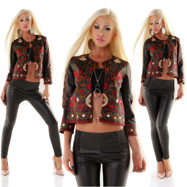 Giacca donna ecopelle ricamo floreale giubbino bolero maniche lunghe boho