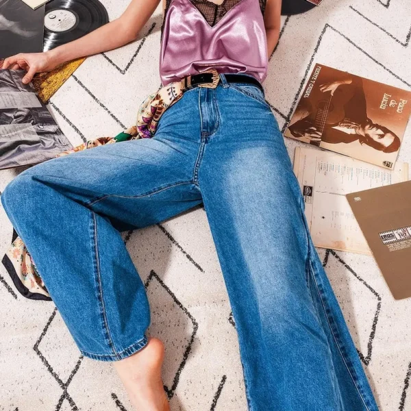 Jeans donna a gamba larga svasato palazzo in blu lavaggio medio