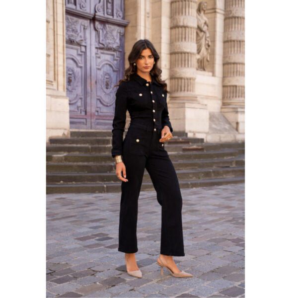 Tuta in denim push up donna a gamba larga con tasche ,bottoni manica lunga