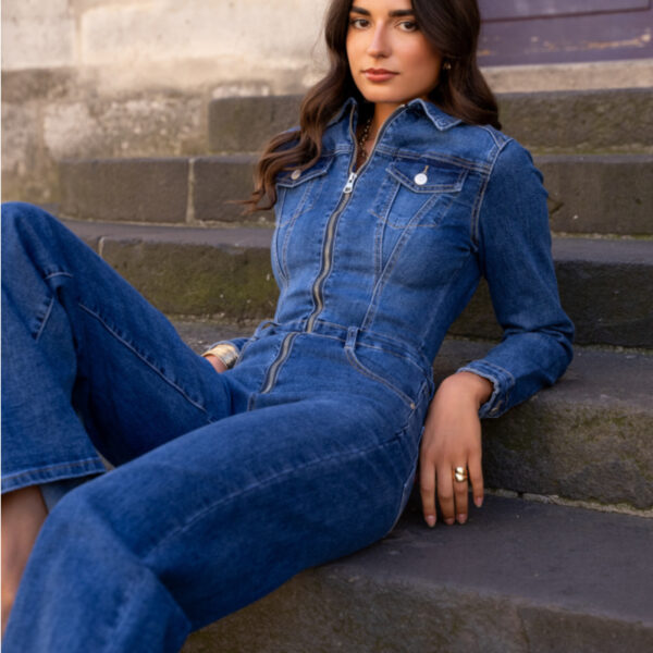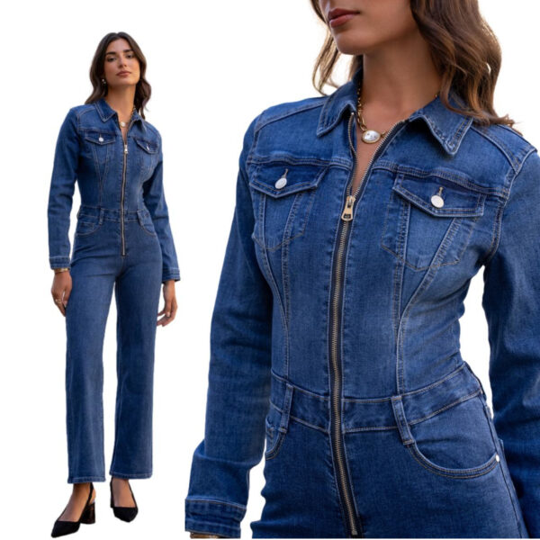 Tuta in denim jeans donna a gamba larga maniche lunghe con zip